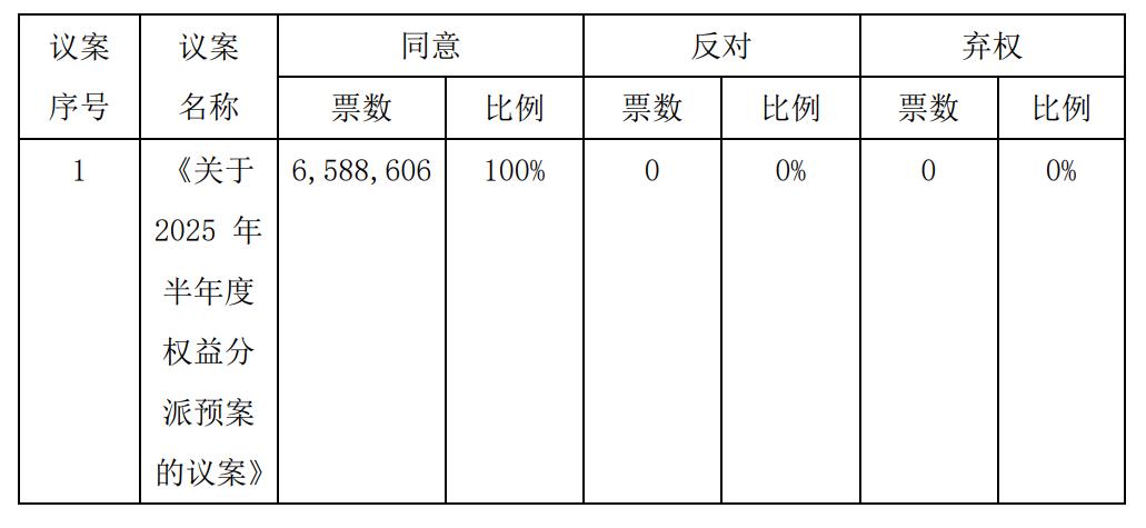 1. The voting result of the proposal is that 57917291 shares, accounting for 100% of the total voting shares of this shareholders' meeting, have been approved; Oppose 0 shares, accounting for 0% of the total number of voting shares in this shareholders' meeting; No shares were abstained from voting, accounting for 0% of the total number of voting shares in this shareholders' meeting.