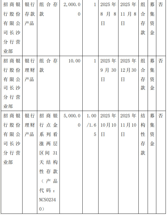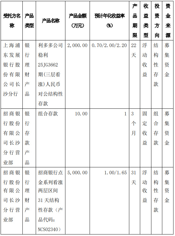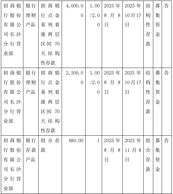 (2) Explanation of using idle fundraising funds for cash management. The products used by the company for cash management this time are bank structured deposits and combination deposits with low market risk, which can meet the requirements of high safety, good liquidity, and ensuring the safety of principal.