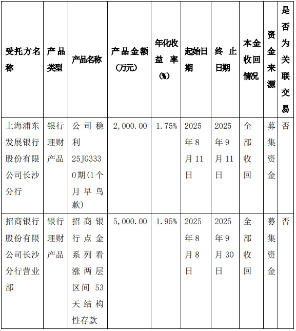 1. The entrusted parties of this cash management product are Shanghai Pudong Development Bank Co., Ltd. Changsha Branch and China Merchants Bank Co., Ltd. Changsha Branch. The board of directors of the company has conducted necessary investigations on the basic information, credit situation, and transaction performance ability of the entrusted parties. The entrusted parties have a good credit situation and possess transaction performance ability. 2. This cash management does not constitute a related party transaction.